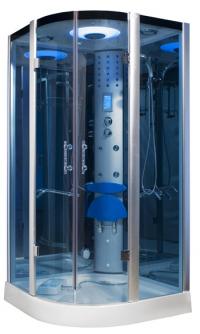 akrylová vanička a strop s perlescentním efektem, dotykový displej, ventilátor, rádio, osvětlení s chromoterapií, ruční sprcha, tropický déšť, šest zádových trysek, sedátko s opěrkou, masáž nohou, 2x skleněná polička, termostatická baterie, 2x madlo, rozměry 93 x 93 x 212cm, výška vaničky 15cm